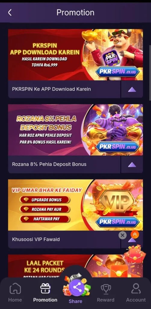 The app also offers daily bonuses and exciting events, keeping players engaged every day. With fast withdrawals and multiple payment options, PKR spin ensures a smooth experience from spinning to earning. Whether you are playing casually or aiming for bigger rewards, PKRspin Game offers endless fun and a chance to turn your spins into real cash.